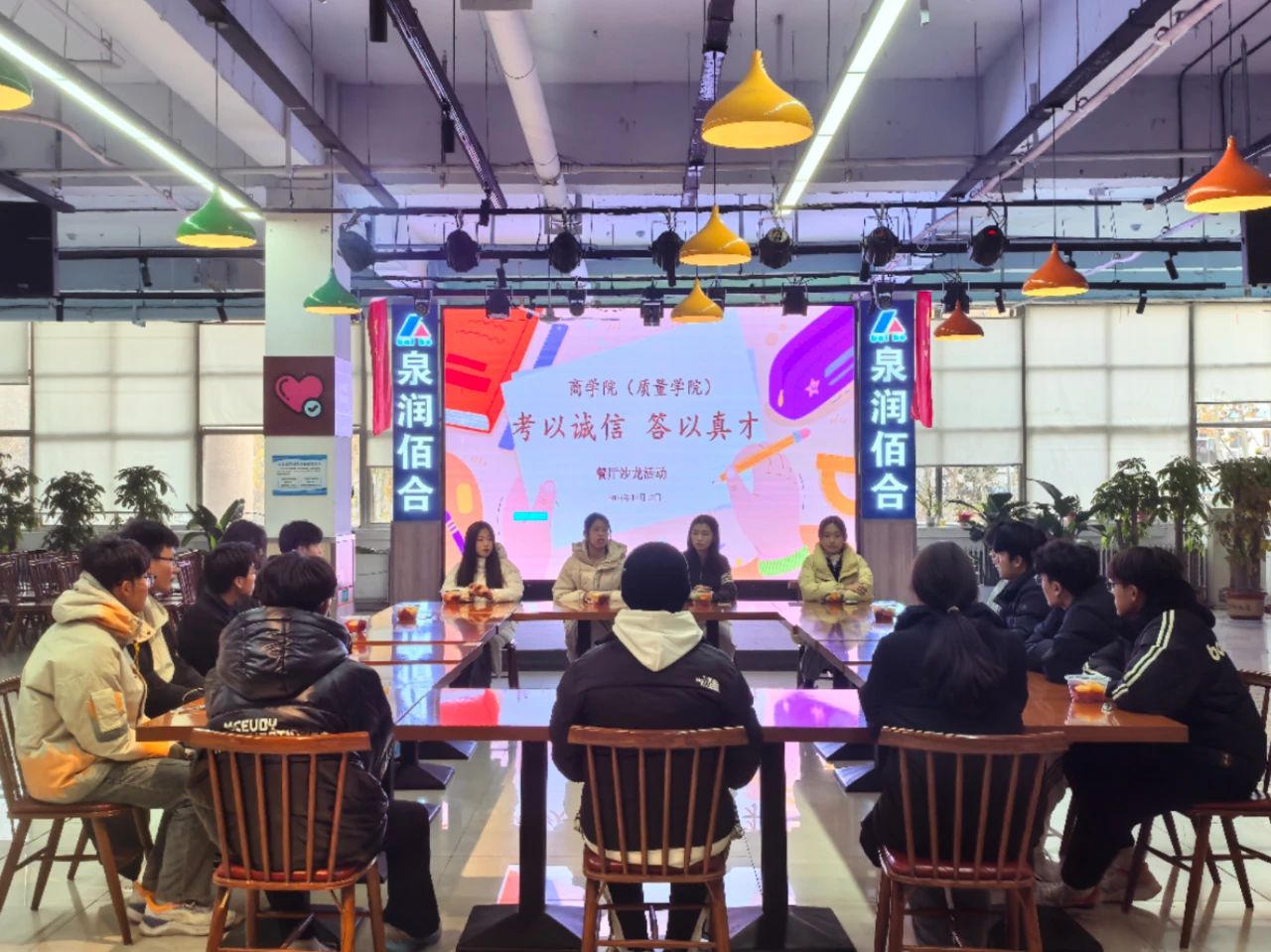 为严肃考风考纪,规范考试秩序,引导学生筑牢诚信根基,切实加强优良考风学风建设,维护教育考试的公平公正,12月12日,万象城awc官网登录入口于东校区翰苑餐厅二楼开展了“考以诚信、答以真才”主题餐厅沙龙活动,学院辅导员施安琪老师和刘聪睿老师结合各类全国性考试以及体育测试中的作弊替考行为,对同学们在考试中出现违纪心理进行分析,让学生从思想上高度重视考纪的严重性。