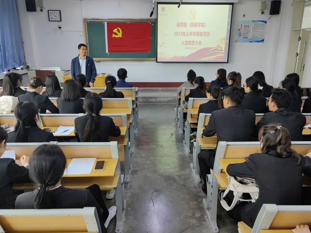 铮铮钢铁誓,拳拳报国心。伴着庄严雄壮的《国际歌》,入党宣誓大会拉开了帷幕。主讲人宣读学生党支部58名发展党员名单后,参会同志怀着不忘初心的信念,揣着为共产主义事业奋斗终身的目标,面向党旗、举起右手,庄严宣誓。“我志愿加入中国共产党,拥护党的纲领,遵守党的章程,履行党员义务,……”许下为共产主义奋斗终身的誓言,展现入党的决心和担当。刘玉华勉励预备党员要牢记共产党员的义务和责任,严守党的纪律,牢记誓言,牢记使命,加强思想教育,努力学习理论知识和专业知识。发挥党员先锋模范作用。预备党员们纷纷表示,今后将加强学习,修炼自我,永葆上进之心。