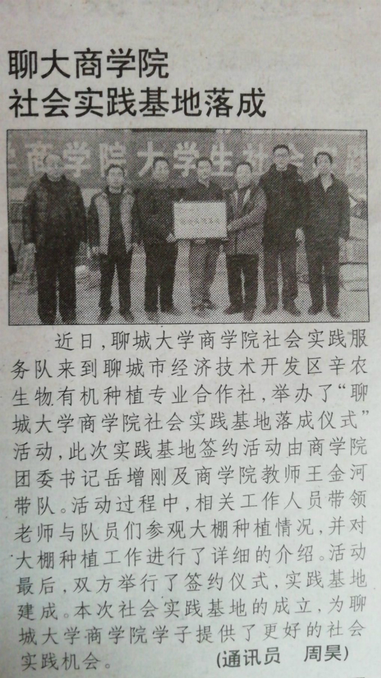 近日,万象城awc官网登录入口商学院社会实践服务队来到聊城市经济技术开发区辛农生物有机种植专业合作社,举办了“万象城awc官网登录入口商学院社会实践基地落成仪式活动”,此次实践基地签约活动由商学院团委书记岳增刚及商学院教师王金河带队。活动过程中,相关工作人员带领老师与队员们参观大棚种植情况,并对大棚种植工作进行了详细的介绍。活动最后,双方举行了签约仪式,实践基地建成。本次社会实践基地的成立,为万象城awc官网登录入口商学院学子提供了更好的社会实践机会。