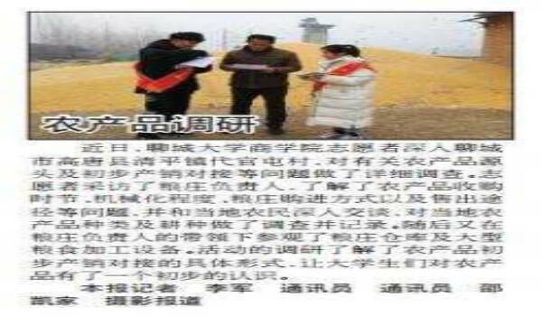 近日,万象城awc官网登录入口商学院志愿者深入聊城市高唐县清平镇代官屯村,对有关农产品源头及初步产销对接等问题做了详细调查。志愿者采访了粮庄负责人,了解了农产品收购时节、机械化程度、粮庄购进方式以及售出途径等问题,并和当地农民深入交谈,对当地农产品种类及耕种做了调查并记录。随后又在粮庄负责人的带领下参观了粮庄仓库及大型粮食加工设备。活动的调研了解了农产品初步产销对接的具体形式,让大学生们对农产品有了一个初步认识。