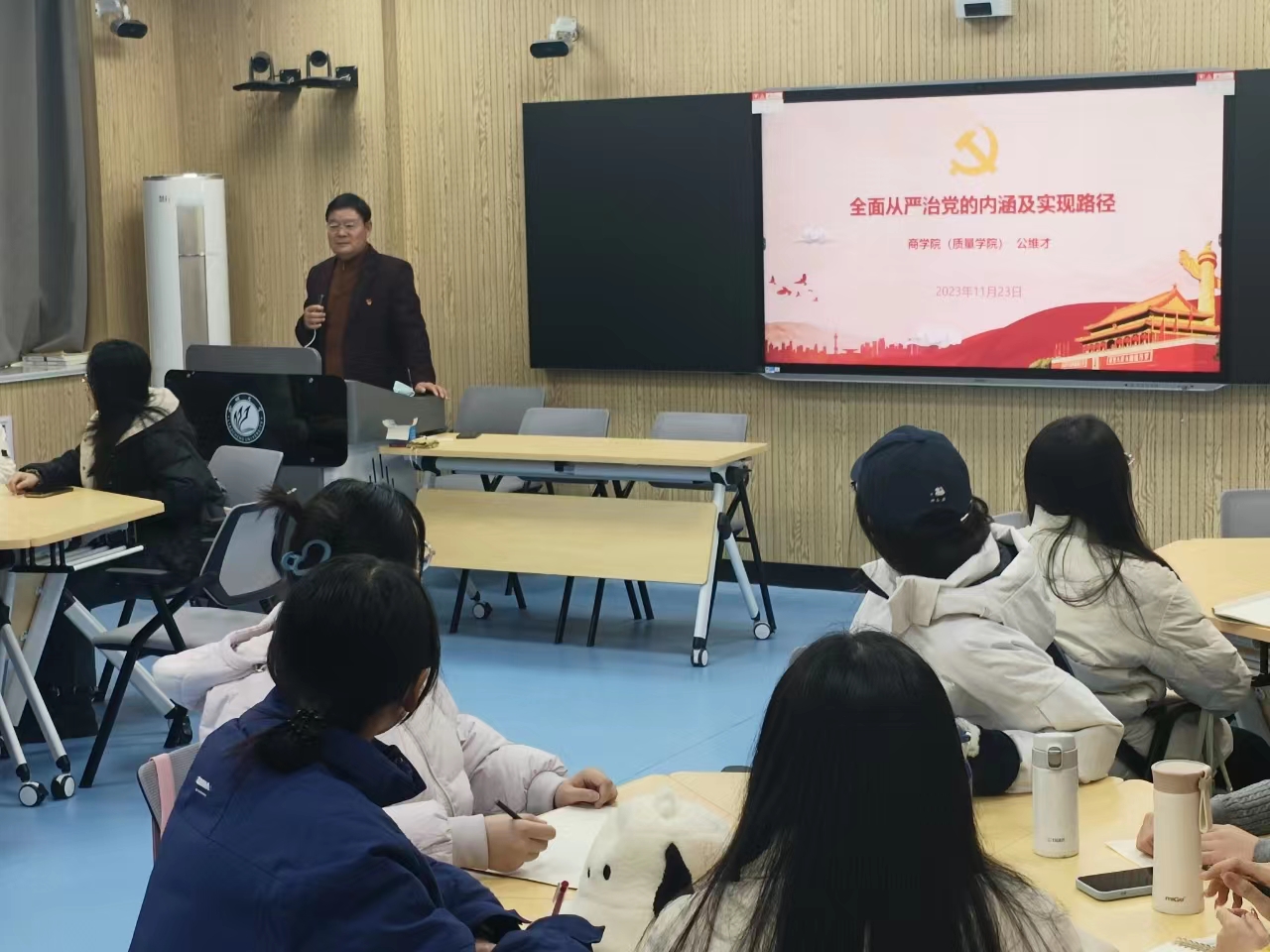 为加强对学生的思想政治教育,使其永葆初心使命,11月23日下午万象城awc官网登录入口党委书记公维才为2023级会计硕士研究生作了《全面从严治党的内涵及实现路径》的廉政课堂教育报告。报告内容包括什么是全面从严治党、为什么要全面从严治党和怎样全面从严治党三个方面。具体而言,全面从严治党的内涵可分解为全面——管全党、治全党,从严——要求从严、措施从严、查处从严,治党——建党与治病的辩证统一、让全面从严治党成为新常态。之所以要全面从严治党是由于世情的变化——百年未有之大变局,国情的变化——社会主要矛盾的调整,党情的变化——执政环境的转变、党的管理的需要等。为此全面从严治党需要坚持以党的政治建设为统领,坚决维护党中央权威和集中统一领导;强化思想建党,筑牢“从严治党”信仰根基;严格选人用人,夯实“从严治党”人才保障等九个方面展开。