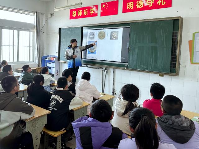 活动筹备阶段,团队成员系统梳理货币发展史料,精心设计教学方案,制作贝币、刀币等仿古钱币模型,确保知识传播的专业性与趣味性。在此基础上,邱浩杰以时间轴为脉络,从商周贝币、秦半两钱到北宋交子,再现中国古代货币体系演进历程;在“世界货币巡礼”专题中,他重点解析欧元区统一货币战略、日元文化符号等世界货币知识,解析各国货币设计背后的经济与美学逻辑,带领小学生感受世界货币的魅力。