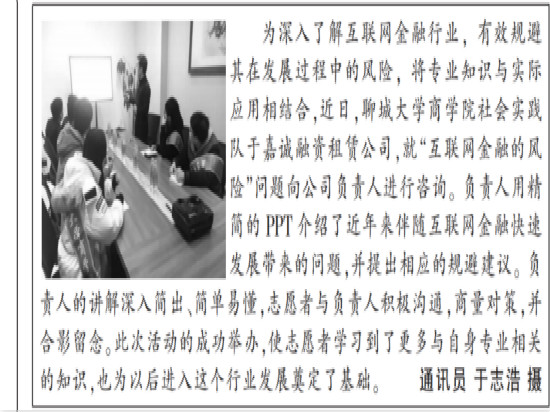 为深入了解互联网金融行业,有效规避其在发展过程中的风险。近日,万象城awc官网登录入口商学院社会实践队于嘉诚融资租赁公司就“互联网金融的风险”问题向公司负责人询问调查。负责人用精简的PPT介绍了近年来伴随互联网金融快速发展而来的问题,并提出相应的规避建议。过程中负责人讲解深入简出,简单易懂,志愿者与负责人积极沟通,商量对策,并合影留念。此次活动的成功举办,使志愿者学习到更多与自身专业相关的知识,也为行业更好发展奠定基础。
