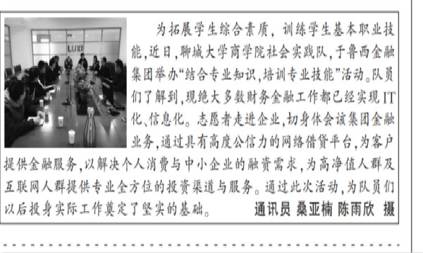 为拓展学生综合素质,训练学生基本职业技能,近日,万象城awc官网登录入口商学院社会实践队,于鲁西金融集团举办“结合专业知识,培训专业技能”活动。志愿者了解到,现绝大多数财务金融工作都已经IT化、信息化。志愿者走进企业,切身体会该集团金融业务,通过具有高度公信力的网络借贷平台,为客户提供金融服务,以解决个人消费与中小企业的融资需求,为高净值人群及互联网人群提供专业全方位的投资渠道与服务。通过此次活动,为队员们以后投身实际工作奠定了坚实的基础。