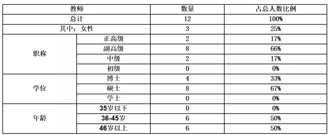 现有专任教师12人,其中教授2人,副教授8人,外聘专家8人,高级职称人数占比达到83%。