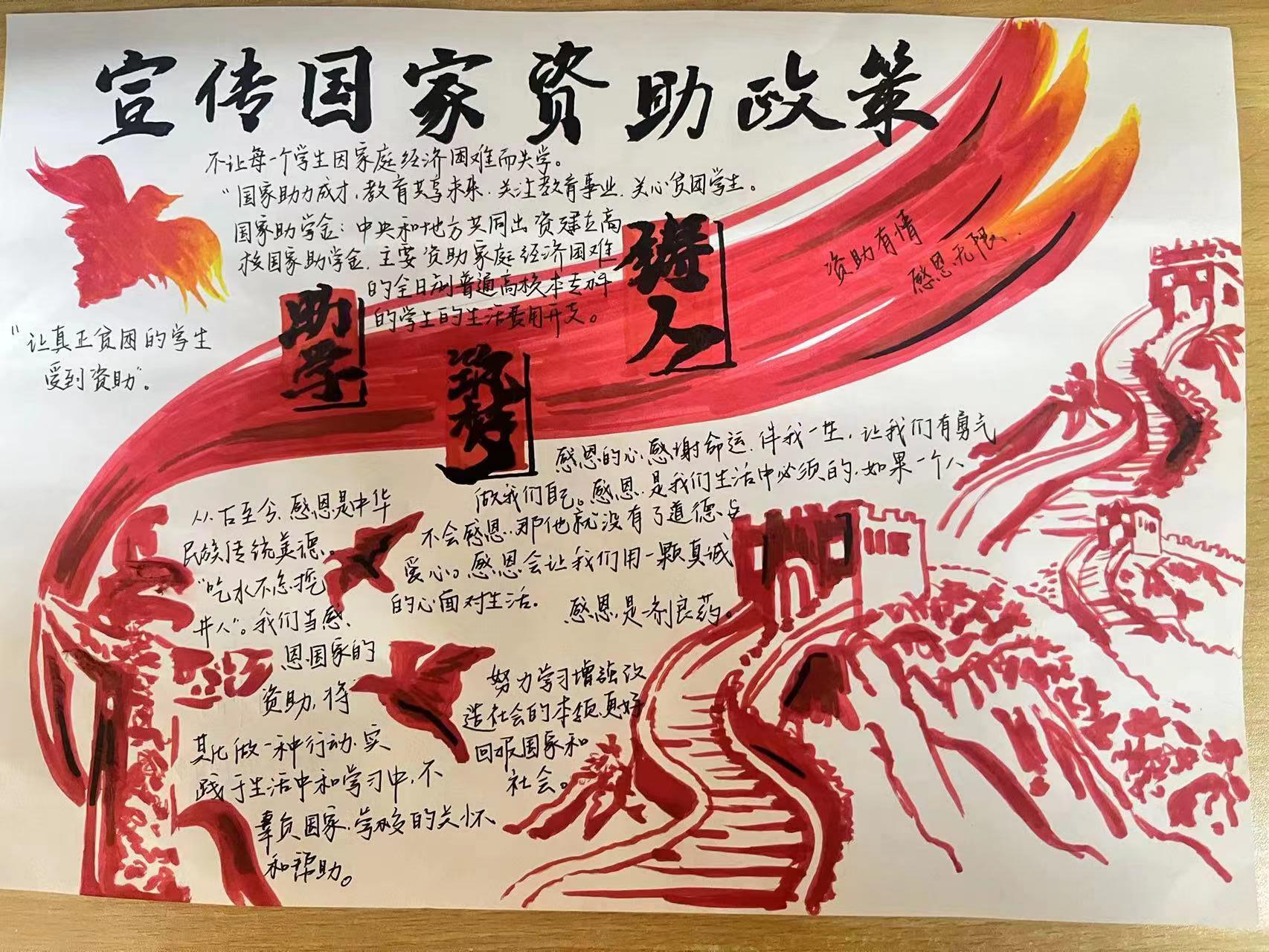 同学们积极参赛,踊跃报名,及时在规定时间上传自己的作品。我们了解到,在制作手抄报的过程中,同学们积极查阅学生资助的各类政策,并围绕本次活动主题,用画笔勾勒育人画面,用艺术表达感谢真情。手抄报的形式更是丰富多样,水彩、马克笔、国画等各有特色,每一份作品都展现了同学们丰富的想象力和创造力,充分体现了同学们对资助育人政策的深刻理解,切实抒发了自己对资助育人政策的感恩之情。活动后期,通过评委们的认真评审,反复比较,最终投票选出了此次活动的一、二、三等奖。最后,活动负责人呼吁同学们继续关注并支持资助育人政策,怀揣着一颗感恩的心,向他人和社会传递温暖和爱心,将所学的知识和能力将来奉献给社会。