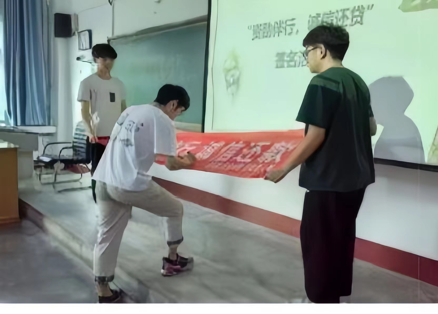 活动伊始,主持人宣读活动主题及活动目的。随后受资助的学生代表向在场学生分享自己的贷款经历与感受,从各方面梳理还款的注意事项,并指出按时还款还息对个人征信的重要性。活动中期,所有出席人员在印有“资助伴行,诚信还款”的横幅上庄重地签下了自己的名字,以此表明自己的诚信意识。最后,主持人进行总结并再次强调诚信还款的重要性,希望贷款毕业生带着感恩之心,保持良好的信用记录。毕业生们纷纷表示,将会在未来的学校生活中按时还款,坚守诚信的品质,肩负起社会责任。